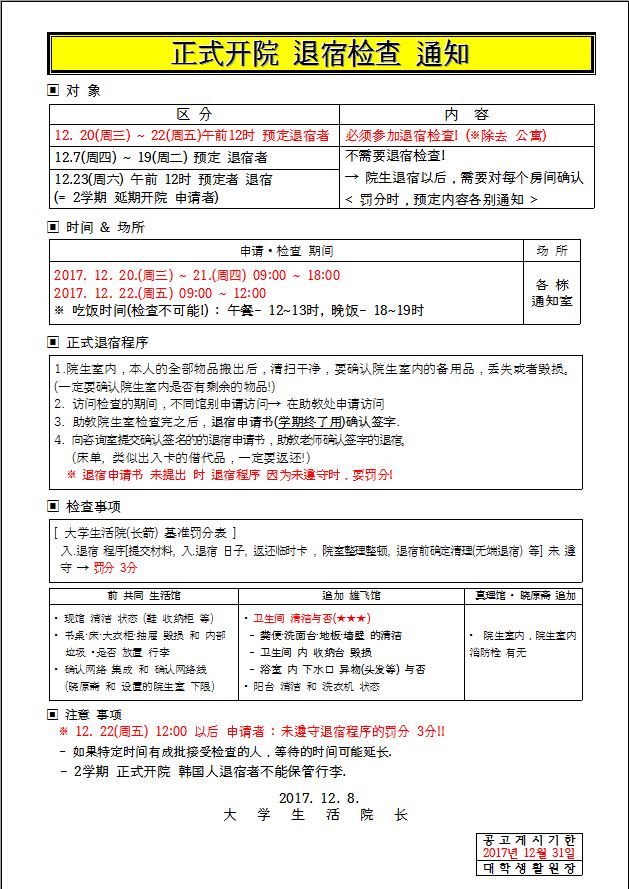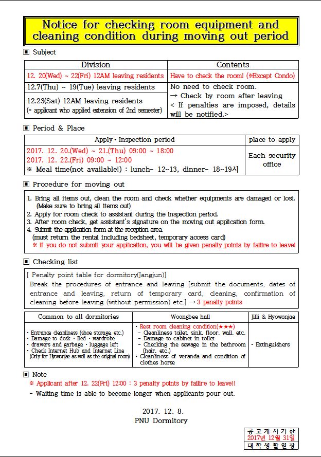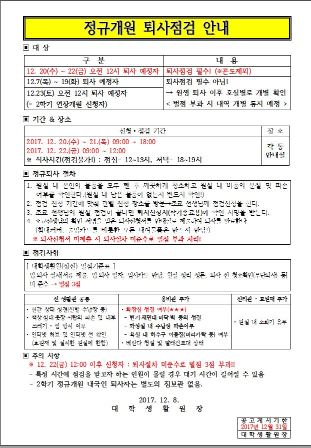 정규개원 퇴사점검 안내 Notice for checking room during moving out period
